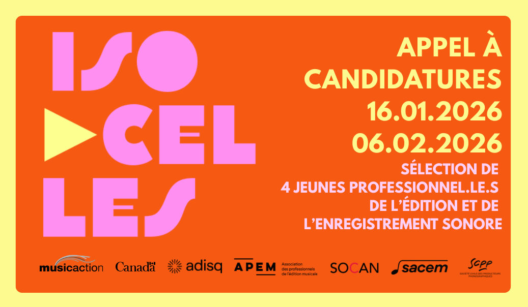 Du 16 janvier au 6 février 2026, la Fondation Musicaction, en collaboration avec l’Adisq, l’APEM et la SOCAN, lance un appel à candidatures pour sélectionner les quatre professionnel.le.s de l’édition et de la production d’enregistrements sonores qui bénéficieront d’une mise en réseau aux côtés de quatre professionnel.le.s de la France, sélectionnées par la SACEM et la SCPP.