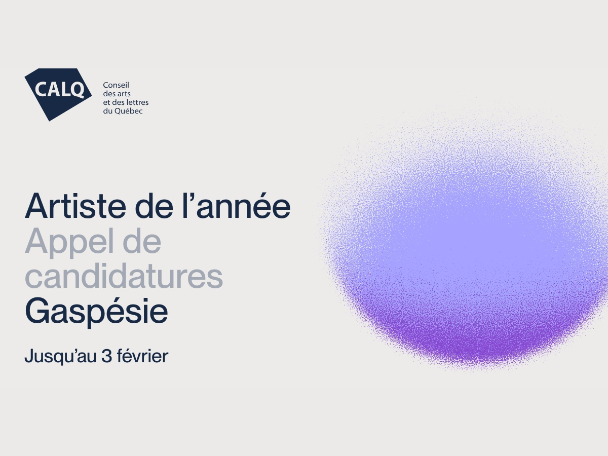 Bonaventure, le 18 novembre 2025 – Le Conseil des arts et des lettres du Québec (CALQ), en collaboration avec Culture Gaspésie, lance un appel de candidatures pour le Prix du CALQ – Artiste de l’année en Gaspésie. Les dossiers doivent être déposés auprès du CALQ au plus tard le 3 février 2026.