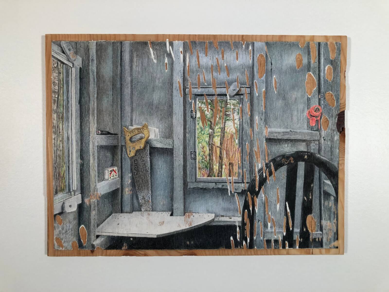 Recourant à une variété de techniques — cuisson céramique en plein air, pyrogravure, gravure, ou encore dessin — Élise Dubé cherche à rendre visible ce qui échappe au regard. Adossée au mur de la galerie, une planche de sapin porte des mots inscrits comme autant de points d’ancrage pour penser le lieu observé. Une maquette de maison, façonnée à partir d’argile prélevée dans la rivière Saint-Jean, a éclaté lors de la cuisson ; ses fragments, présentés au mur, témoignent d’un processus où le contexte de création agit sur la forme. Des dessins sur panneaux de contreplaqué donnent à voir des scènes d’intérieurs domestiques qui suggèrent toutefois, en hors-champ, la proximité de la vie sauvage.