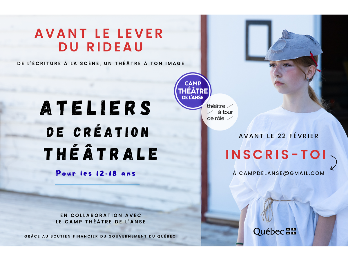 Ce projet de création théâtrale*, destiné aux jeunes de 12 à 18 ans de la Baie-des-Chaleurs, sera déployé du printemps à l’automne 2026. Il offrira aux participant·es une immersion complète dans le processus de création théâtrale, de l’écriture à la présentation publique.
