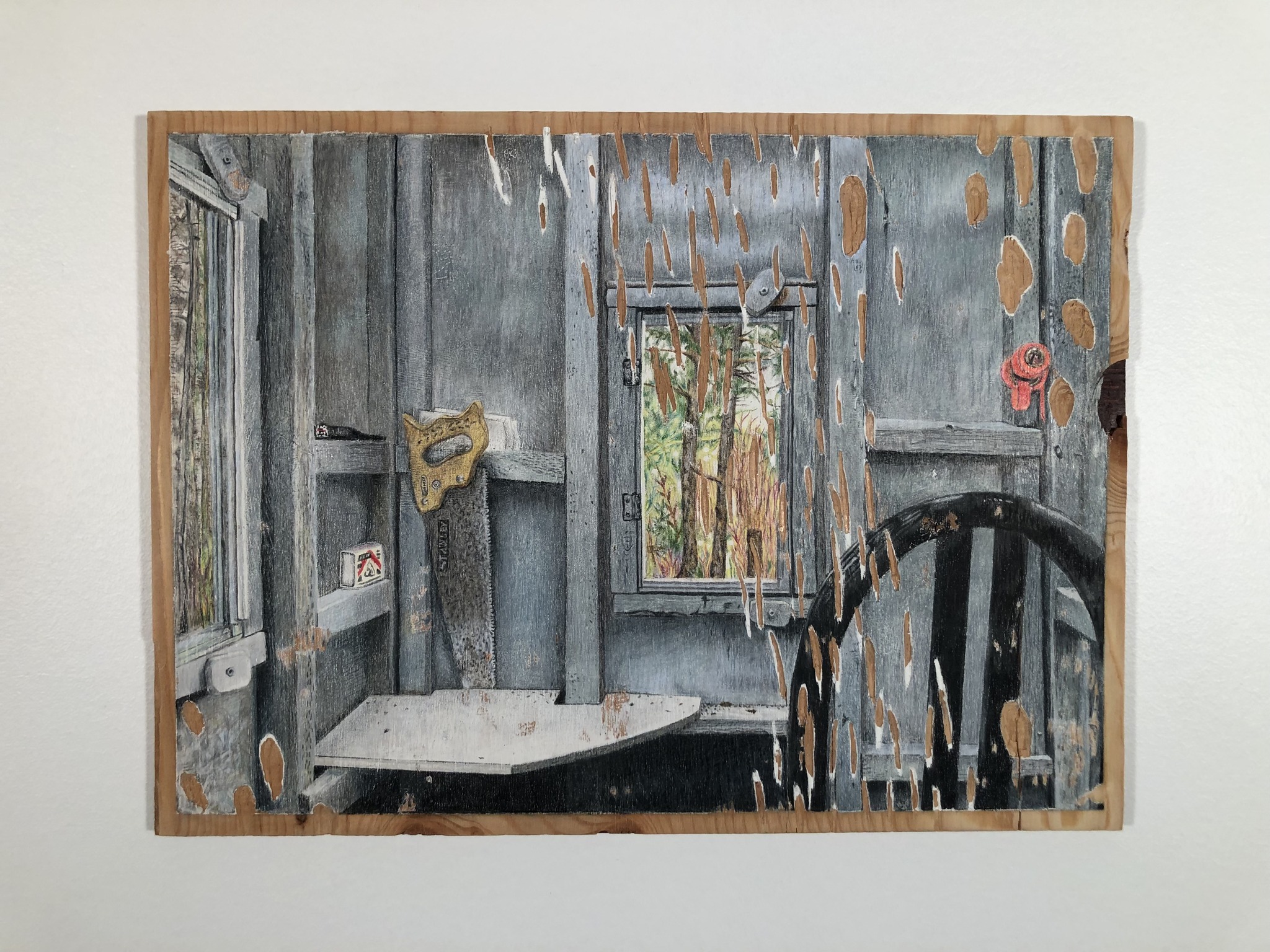 L’exposition Broussailles prend pour point de départ les lieux que l’artiste Élise Dubé habite : sa maison, sa shed, sa terre à bois, et les broussailles qui les entourent. À travers des dessins et de petites installations, l’artiste explore les frontières entre l’espace domestique et l’espace naturel, sondant la relation qu’elle entretient avec ces lieux — des lieux qui, autant qu’elle les habite, la façonnent. Inscrite dans une posture écoféministe attentive à la notion de care, sa démarche interroge notre rapport à la nature à partir d’un regard situé. Recourant à une variété de techniques — cuisson céramique en plein air, pyrogravure, gravure, ou encore dessin — Élise Dubé cherche à rendre visible ce qui échappe au regard. Adossée au mur de la galerie, une planche de sapin porte des mots inscrits comme autant de points d’ancrage pour penser le lieu observé. Une maquette de maison, façonnée à partir d’argile prélevée dans la rivière Saint-Jean, a éclaté lors de la cuisson ; ses fragments, présentés au mur, témoignent d’un processus où le contexte de création agit sur la forme. Des dessins sur panneaux de contreplaqué donnent à voir des scènes d’intérieurs domestiques qui suggèrent toutefois, en hors-champ, la proximité de la vie sauvage.
