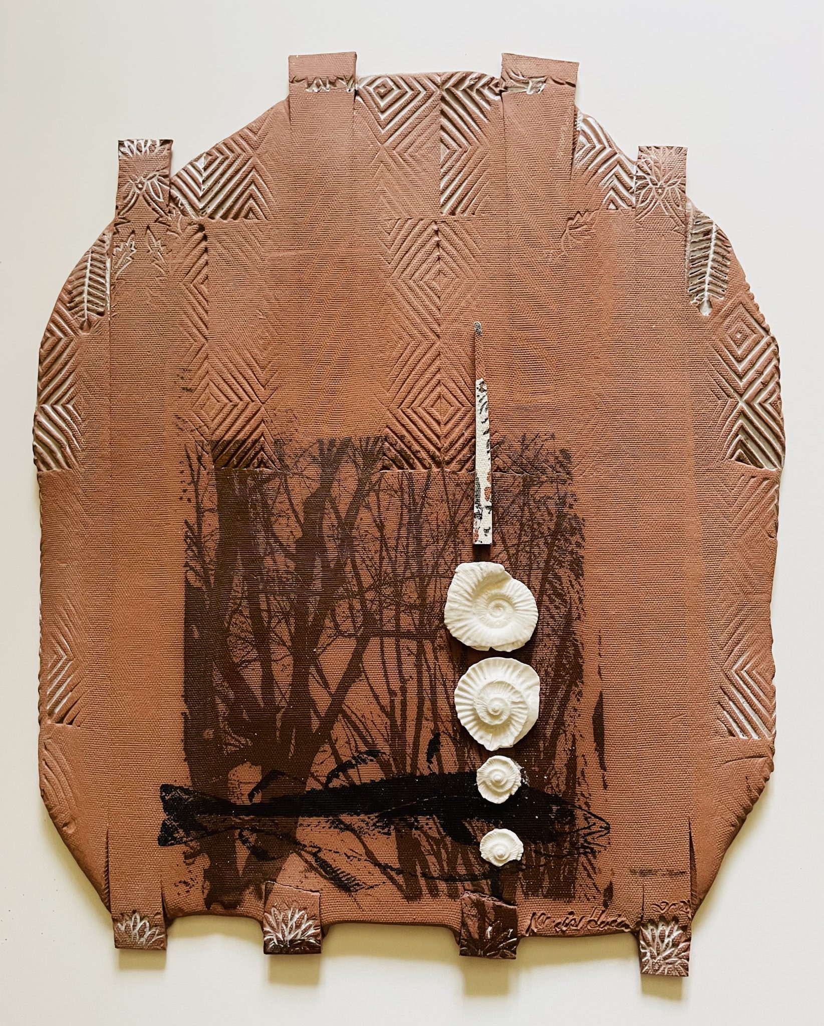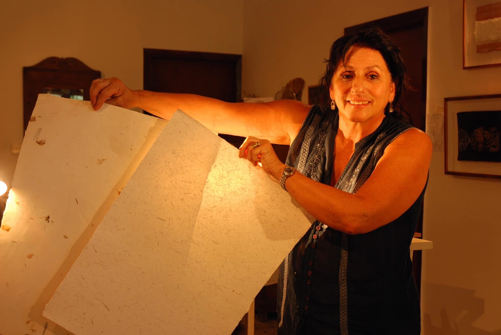 Formée à l’Institut des Arts Appliqués et aux Beaux-Arts, Denise Hudon s’impose d’abord comme première femme muraliste au Québec. Sous l’influence d’un maître céramiste, elle se tourne vers la sculpture d’argile et innove dans le papier pulpe moulé. Dès 1984, invitée à représenter le Québec à New York, elle parcourt le monde pendant 23 ans en véritable ambassadrice. Ses explorations en Afrique, en Asie et au Moyen-Orient autour des teintures végétales enrichissent un parcours déjà reconnu et exposé dans des collections prestigieuses, notamment celle du ministère extérieur du Canada. Aujourd’hui, forte de cette notoriété, elle est sollicitée pour représenter le Canada au Mexique.