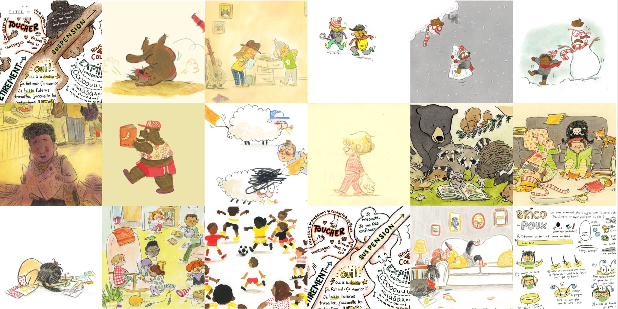 Elle compte une quinzaine de livres à son actif, dont plusieurs primés. Elle aime créer des albums rigolos, qui mettent en lumière l’humour et l’absurde du quotidien, en jouant avec les différents médiums traditionnels et les codes de la bande dessinée.