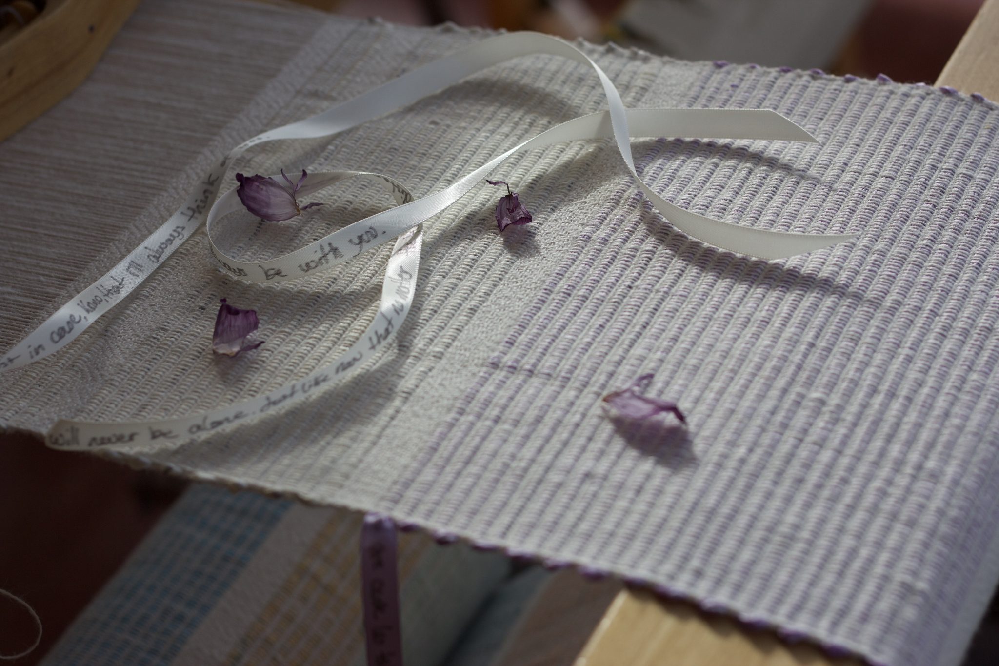 « Peigneurs de laine », « coupeurs de velours de coton » et « trameuses» (Villermé, 1971 [1840]: 95) sont toutes d’anciennes professions oubliées du monde textile. Elles renvoient à une tradition, mais aussi une modernité, celle du premier domaine industrialisé. La Trameuse, nom d’artiste d’Emie Gravel, est un clin d’œil à ce monde. Tissage artisanal et broderie à la main sont au cœur de sa pratique. Elle marque l’universel des petites actions du quotidien grâce à l’intime que le contact avec la matière crée. Dans son travail, le textile est une trace tangible de mémoire, de ce qui l’a touché et de ce qui l’a transformé.
