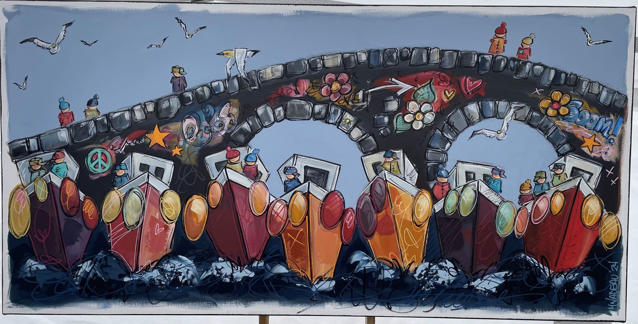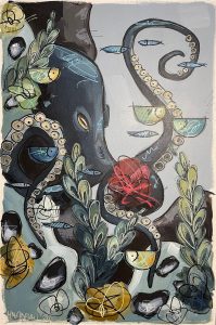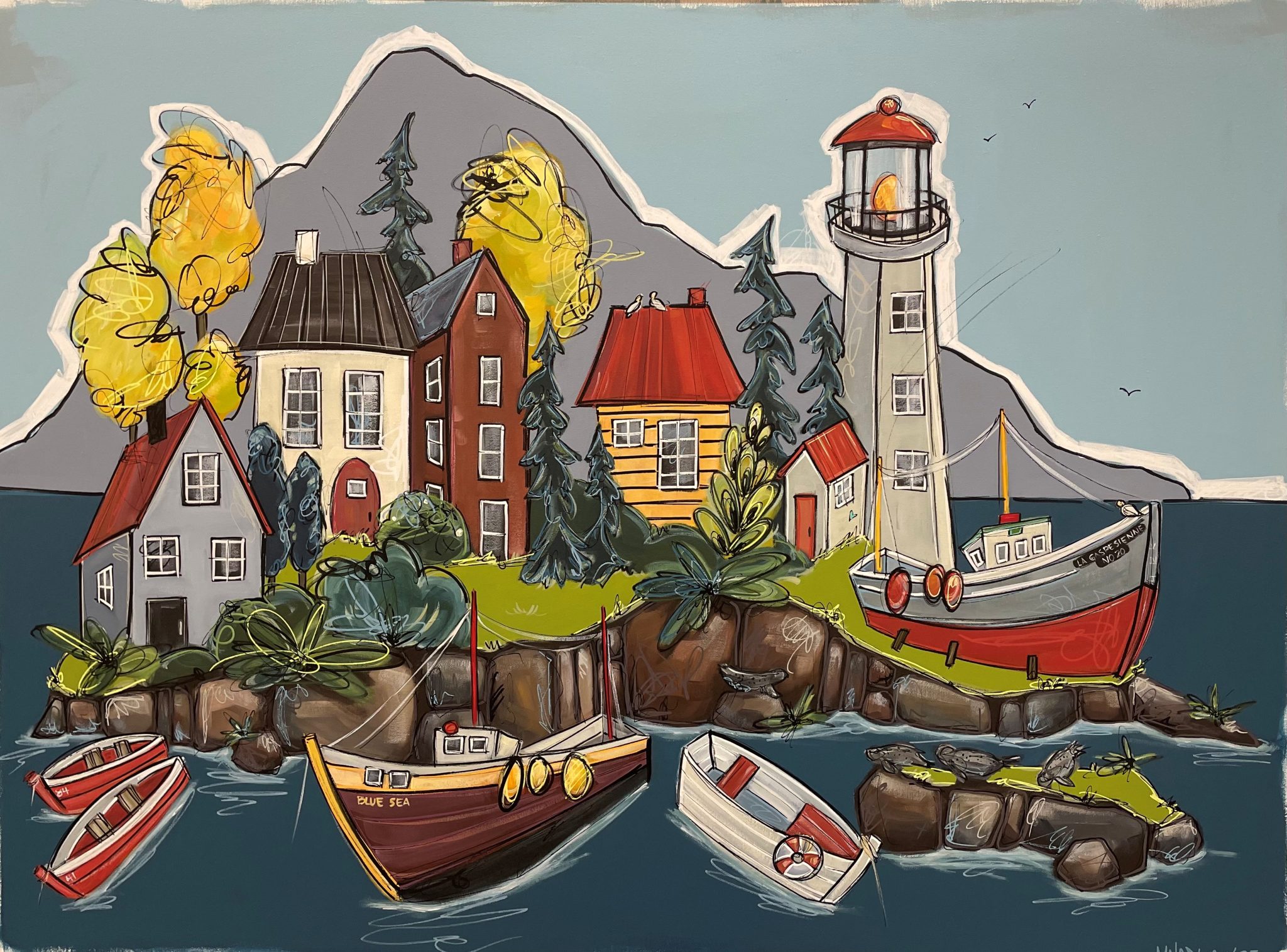 Je travaille à l’acrylique sur toile galerie aux contours peints en noir afin d’éliminer le besoin d’encadrement. Je ne suis pas certaine de ce que je peux ajouter, comme je disais je sais seulement ce que je me suis appris, je vous laisse le soin de nommer le style car j’ai bien de la difficulté à trouver le bon mot. Je demeure à Gaspé et je m’inspire beaucoup de mon milieu, sans m’en limiter, ce qui plaît aux gens de passage aussi bien qu’aux locaux.