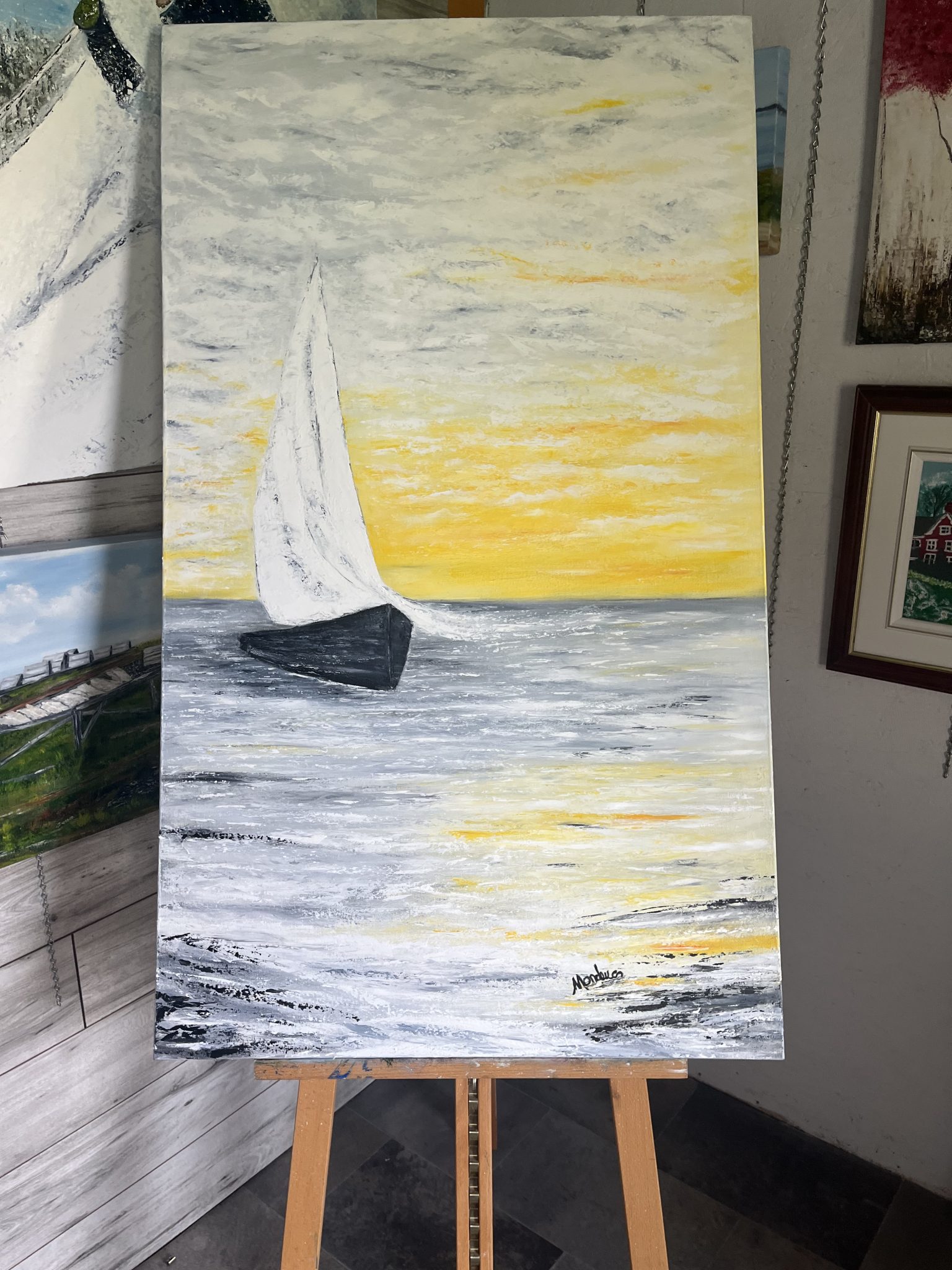 Monique Doucet, artiste peintre Enfant j’étais excitée à l’idée d’avoir en main des crayons de couleurs et je m’évadais en griffonnant sans cesse. La nature, la mer et les rochers m’ont toujours inspirée. J’ai appris à observer les ombres et lumières à travers l’éclat des couleurs. Je pratique mon art depuis 2004. En 2018, lors d’un symposium tenu dans la MRC du Rocher Percé, je me démarque par mes tableaux à l’huile exposés sous le thème « Air salin». Mes toiles se qualifient dans deux styles : le réalisme et l’abstrait. J’utilise différents médiums mais je préfère l’huile. Le plaisir et la liberté que j’ai à manier autant les pinceaux et la spatule sont décuplés lorsque je réussis à rendre l’harmonie entre une mouvance et une atmosphère. L’utilisation de textures me permet de mettre en relief la lumière et d’équilibrer les coloris. Lorsque vous êtes séduits par mes tableaux, c’est que j’ai réussi à vous dévoiler mes émotions. L’art contemporain m’inspire et nourrit ma passion de créer. J’expérimente différentes techniques me permettant de dévoiler des phénomènes climatiques et lumineux.« Lorsque je suis devant ma toile, il naît en moi des émotions que je transforme dans un processus créateur pour vous les dévoiler.»Toujours animée par la volonté de poursuivre mon développement et nourrir ma passion, je m’implique dans différentes associations artistiques et culturelles ainsi que dans ma communauté : • Conseil de la Culture de la Gaspésie, membre depuis 2013. • Municipalité de Grande-Rivière dans des projets récréotouristiques, depuis 2017.• Maison de la Culture de Grande-Rivière et bibliothèque municipale, depuis 2015.• Centre d’artiste Vasque et Vague membre depuis 2019.• Groupement d’artistes en arts visuels de la Gaspésie depuis 2021 (Grand Barbouill’Art) Retraitée de Desjardins, je me consacre pleinement à mon art depuis 2012. J’ai mon atelier – galerie annexée à ma résidence où j’y expose l’ensemble de mes œuvres.Visite de l’atelier sur rendez-vous , au 262, Grande-Allée Ouest Grande-Rivière Ouest Courriel : moniquedoucet@telus.net et Facebook: Mondouc artiste Téléphone : (418) 385-1557